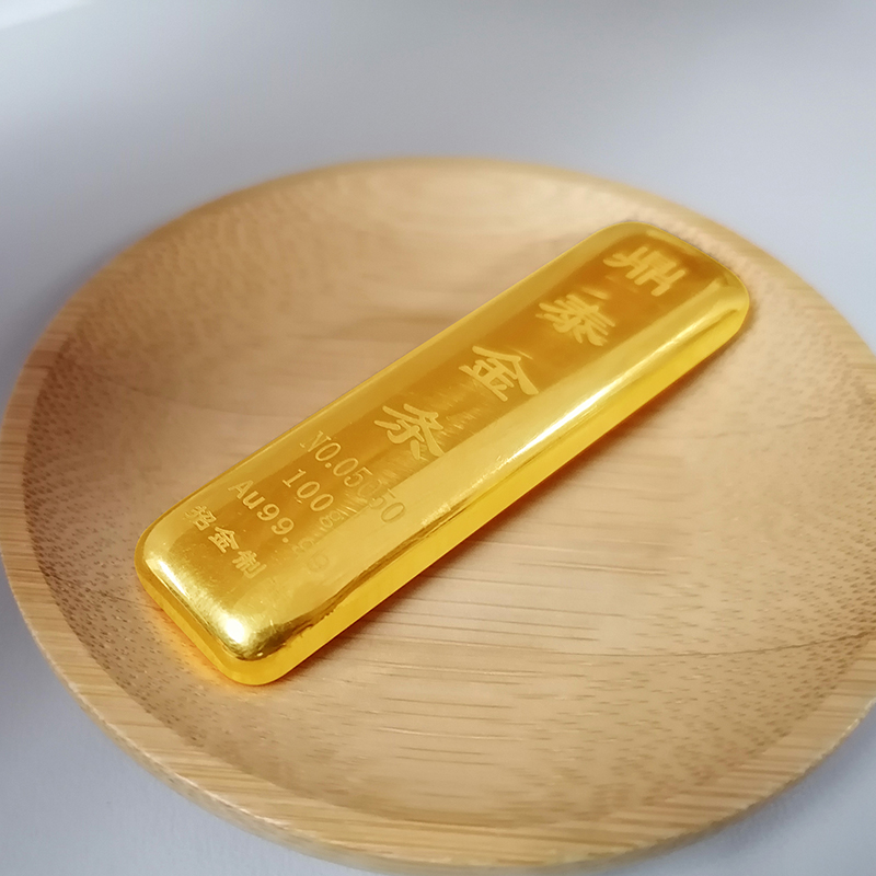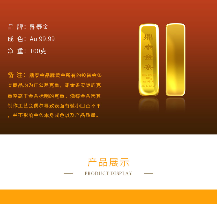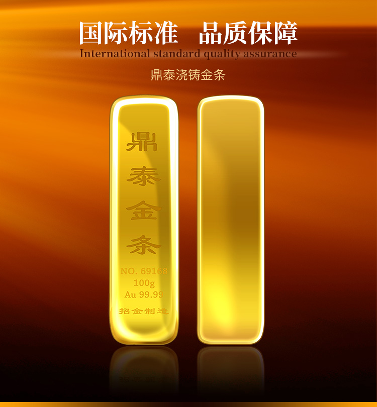出品品牌為“鼎泰金”,經(jīng)澆鑄工藝制作,外觀圓潤,色度飽滿,全流程嚴格按照上海黃金交易所標準制造完成,支持購回。金條正面標注成色、克重、編號等標識。