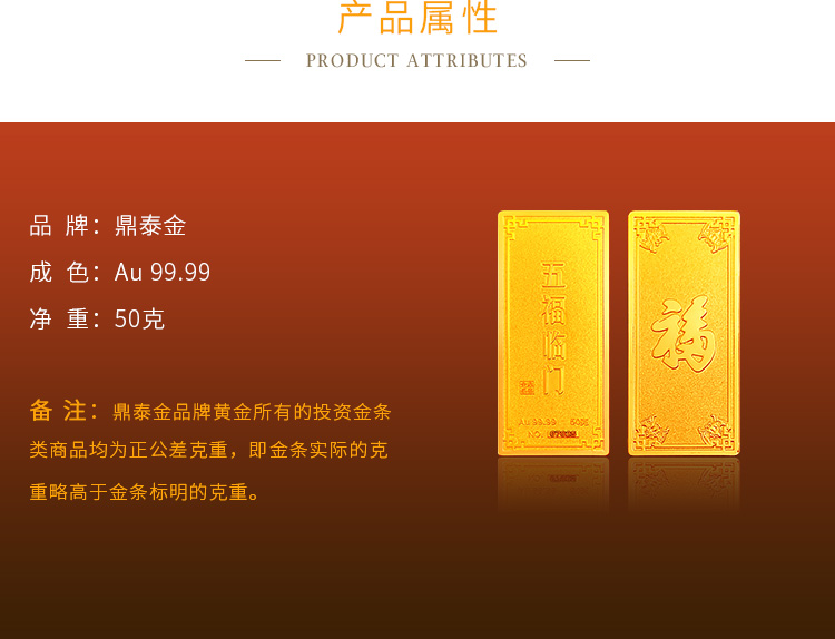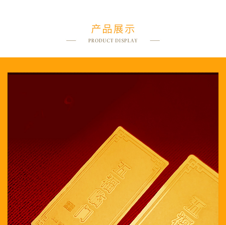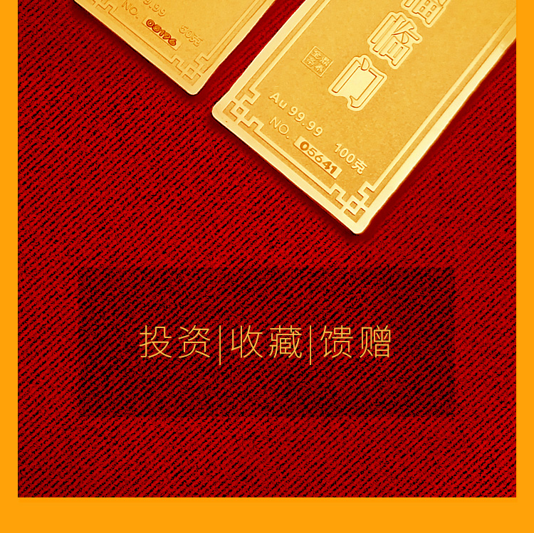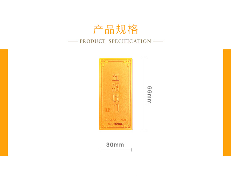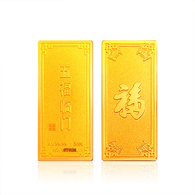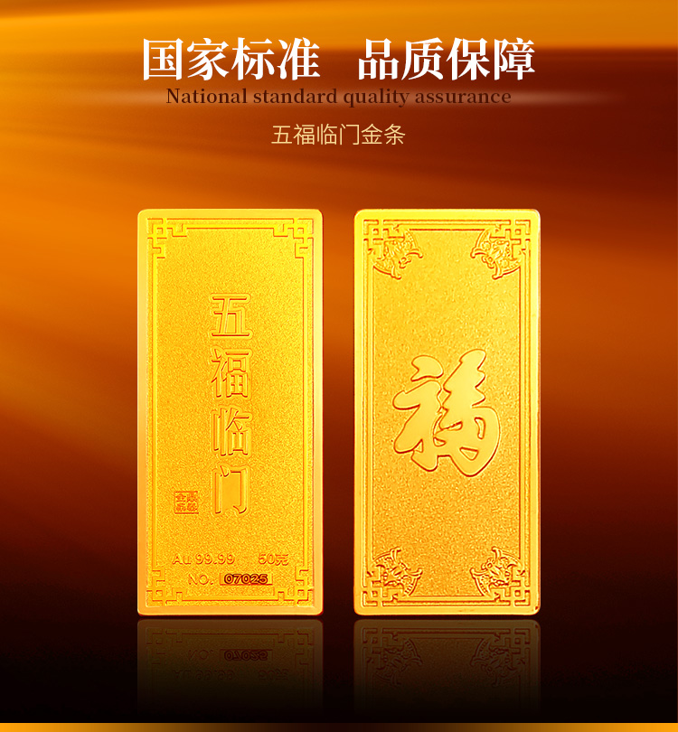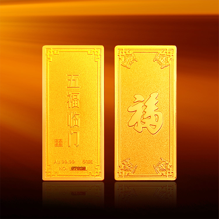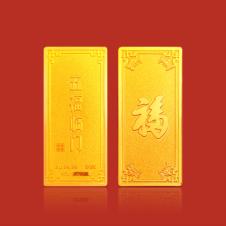 五福臨門系列金條產(chǎn)品,采用油壓工藝制造。正面圖案以康熙手書天下第一福的福字為主題,與四周向心蝙蝠(通福)構(gòu)成五福臨門的美好寓意,反面有五福臨門文字主題及金條成色,克重,編號等標示。