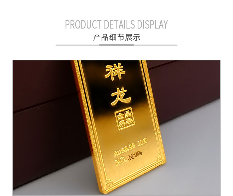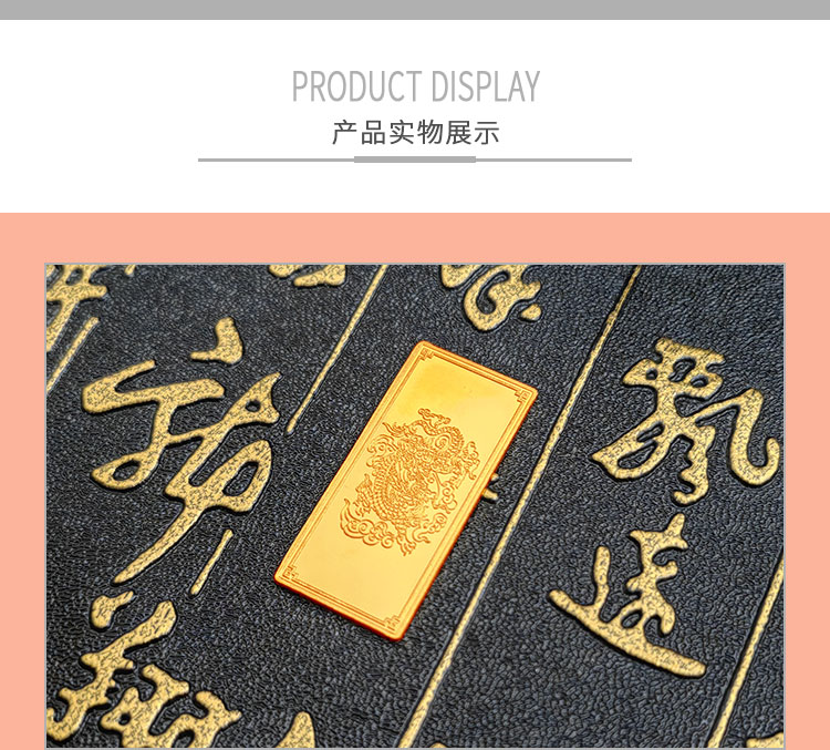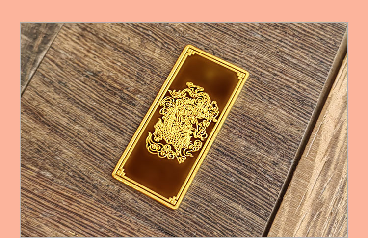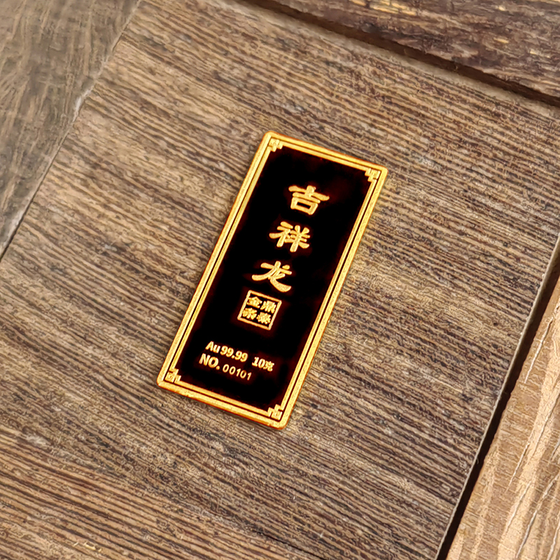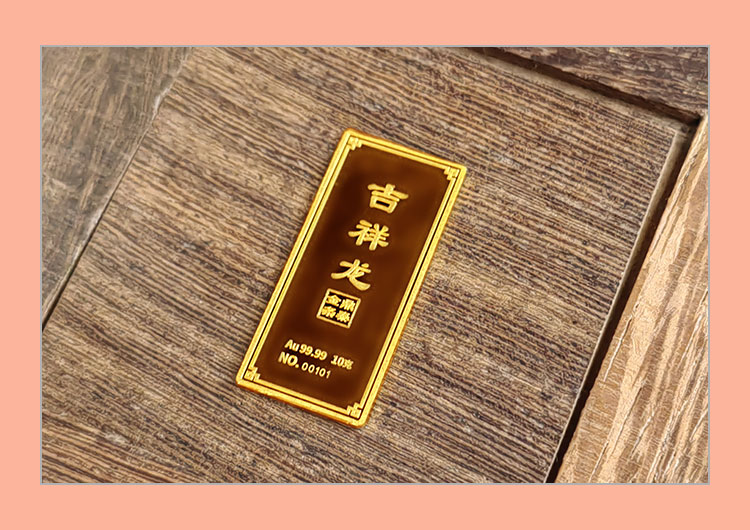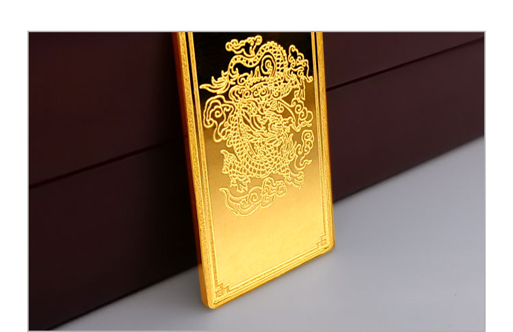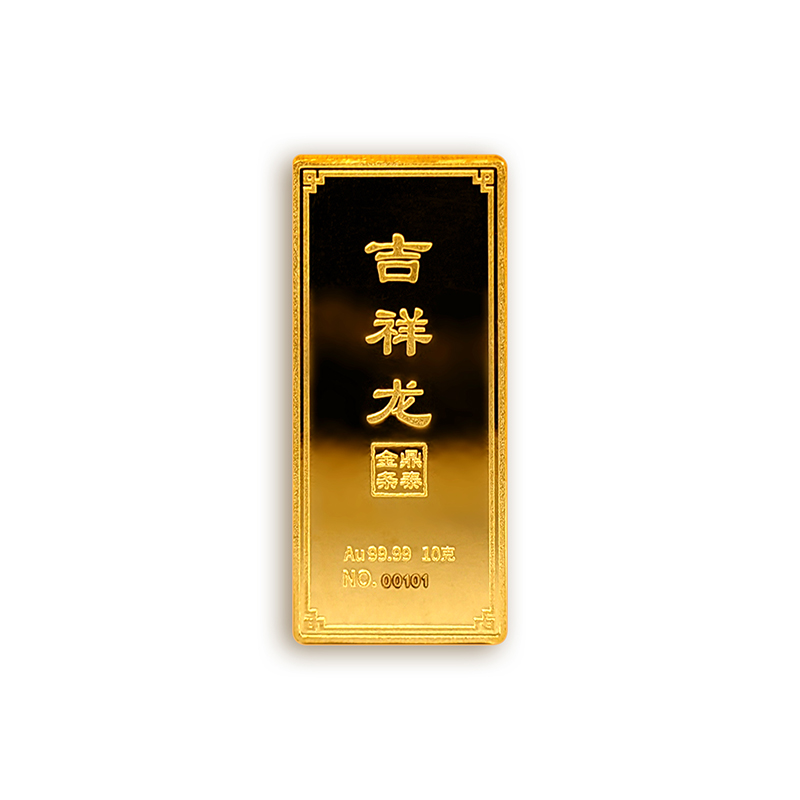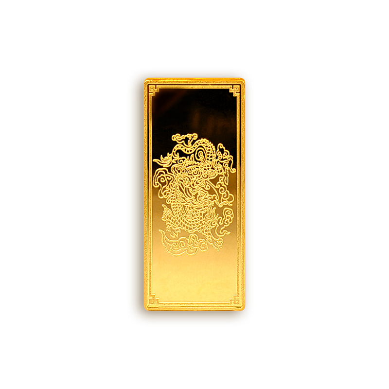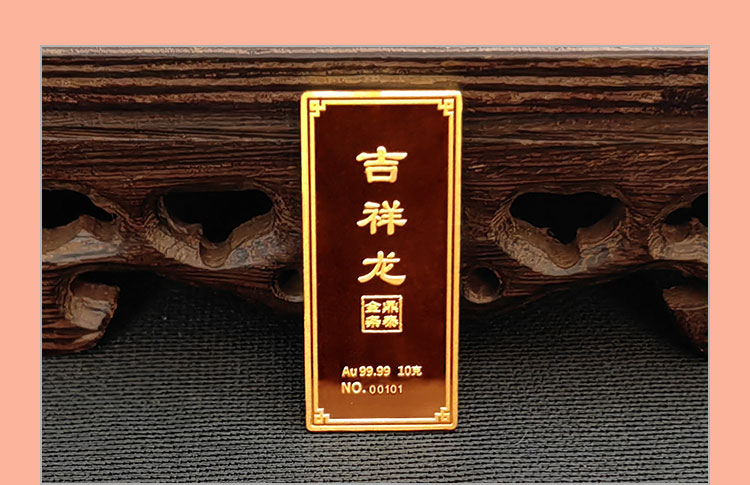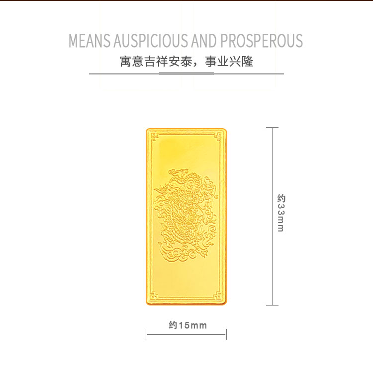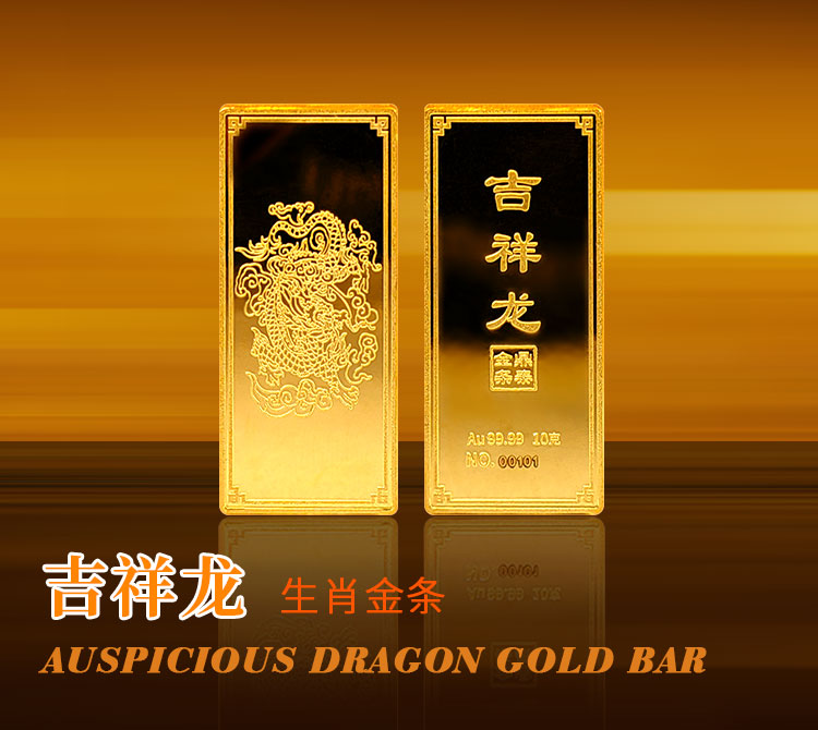 吉祥龍生肖金條以云中行龍,龍游云從為設(shè)計主題,采用油壓工藝制造。金條正面主體為祥云之間的一條金龍,游走于云海之中睥睨天下的造型。龍形為下探游龍,,身姿彎蜒,健美有力。身邊為祥云簇擁環(huán)繞,鱗甲飛揚。反面吉祥龍三字居中,四周回角邊,下方標注有金條成色、克重、編號等。整體設(shè)計寓意龍行天下,財通八方,事業(yè)興旺發(fā)達的美好祝愿。