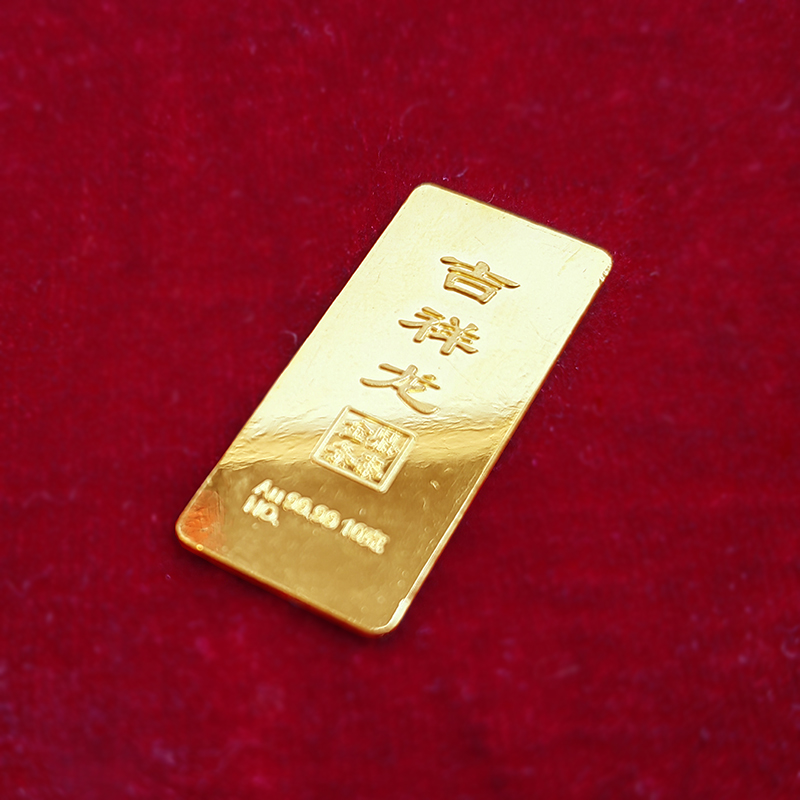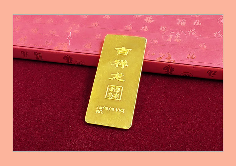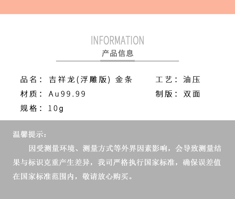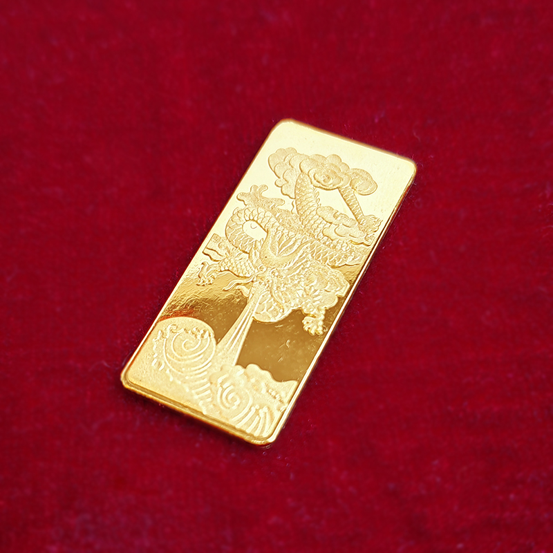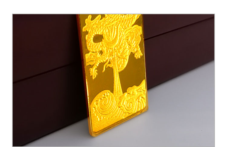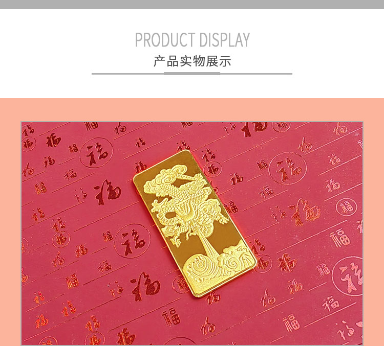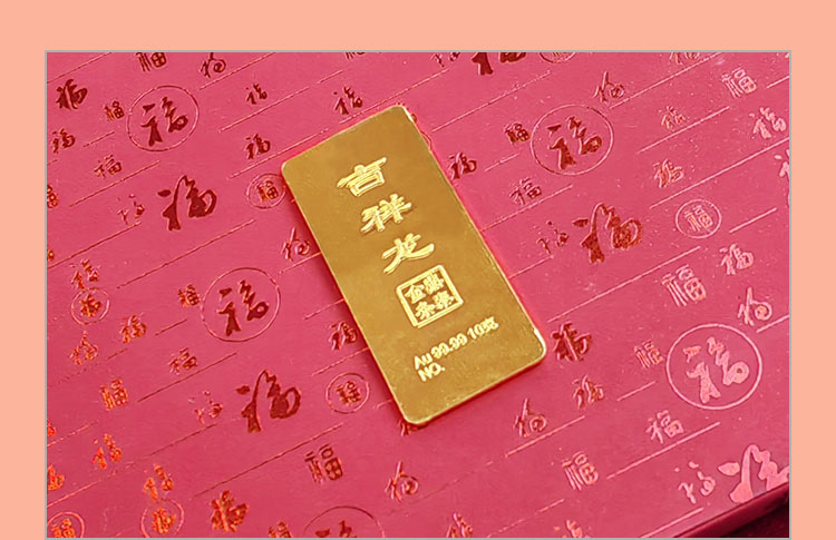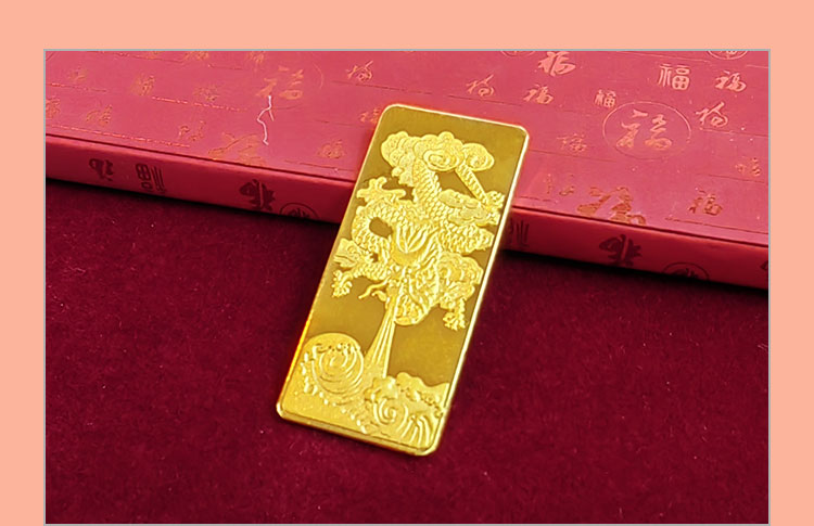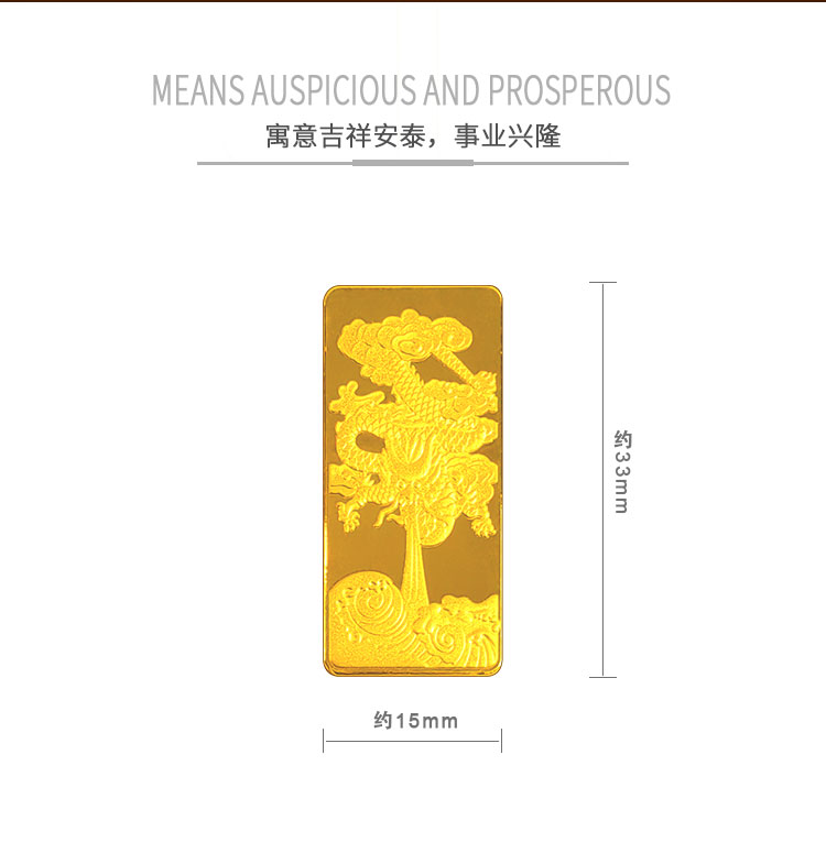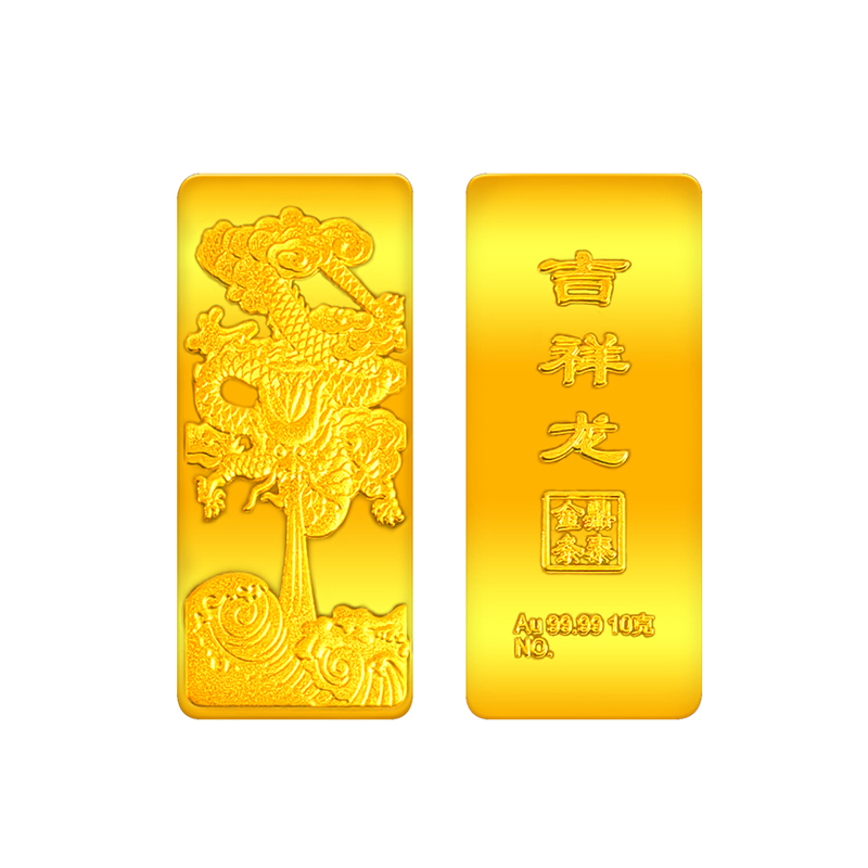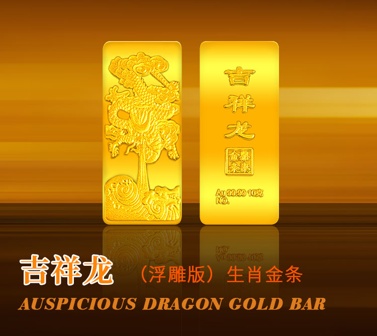 吉祥龍生肖金條以云海盤龍吐水為設(shè)計(jì)主題,采用油壓工藝制造。金條正面主體為云海之間的一條金龍,游走于云海這間吐水布雨的造型。龍形為盤龍,,身姿 彎蜒,健美有力。身邊為祥云簇?fù)憝h(huán)繞,盤龍吐水匯入下方大海。反面吉祥龍三字居中,四周回角邊,下方標(biāo)注有金條成色、克重、編號(hào)等。整體設(shè)計(jì)寓意四時(shí)豐澤,風(fēng)調(diào)雨順,事業(yè)興旺發(fā)達(dá)的美好祝愿。
