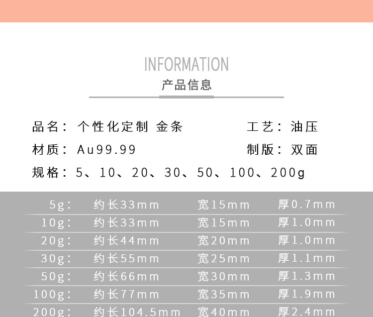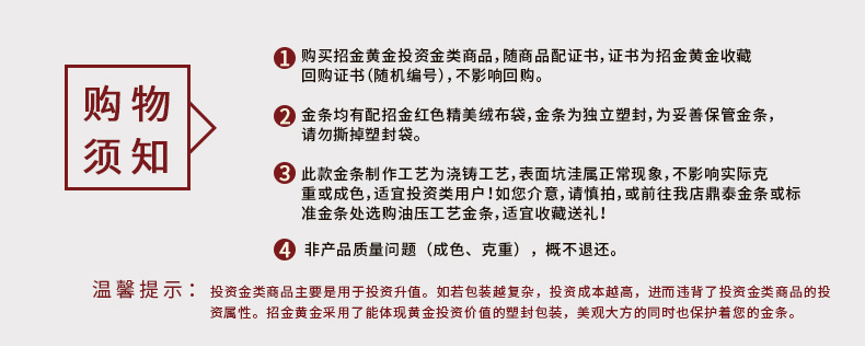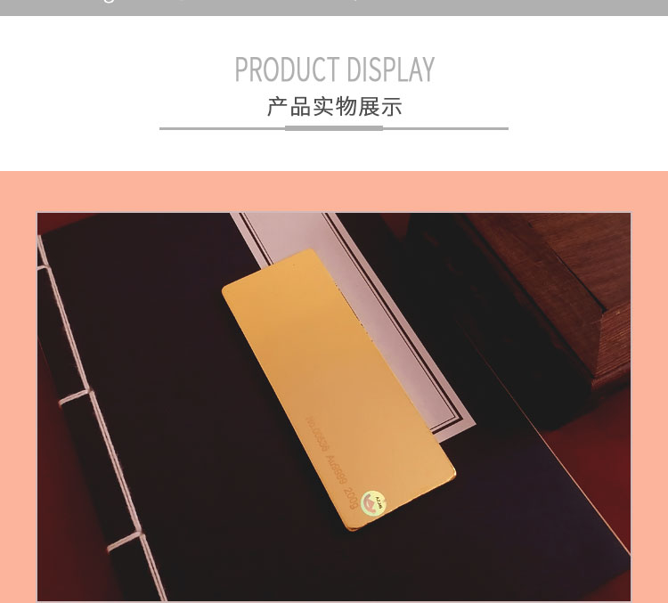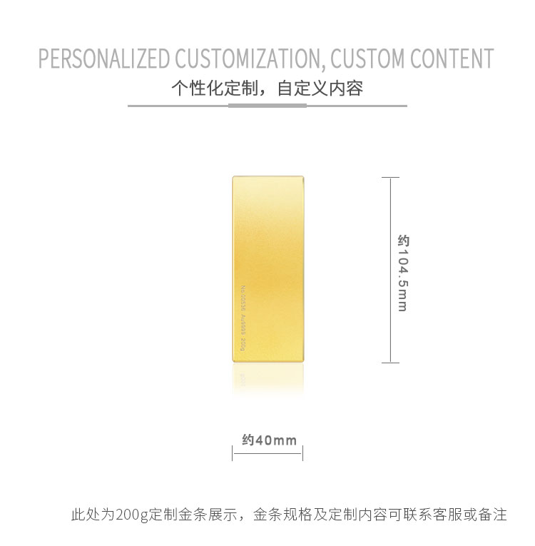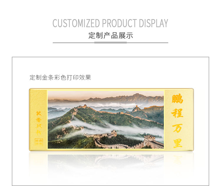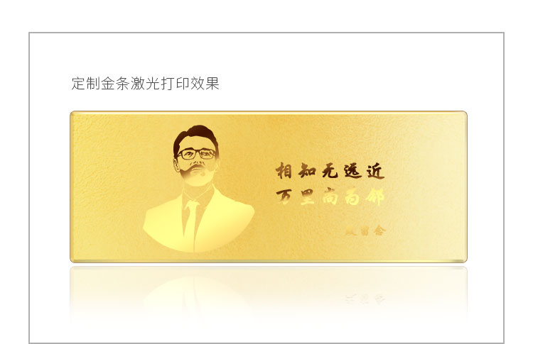 金條可以根據(jù)客戶要求,在金條指定位置處定制激光蝕刻單色圖形或打印彩色圖案??捎糜谥苣陸c典、年終年會(huì)、企業(yè)上市、個(gè)人定制、喬遷紀(jì)念、答謝回饋、員工福利、節(jié)日送禮等,十分適合做為紀(jì)念、留念或饋贈(zèng)禮品,同時(shí)兼具投資保值價(jià)值。