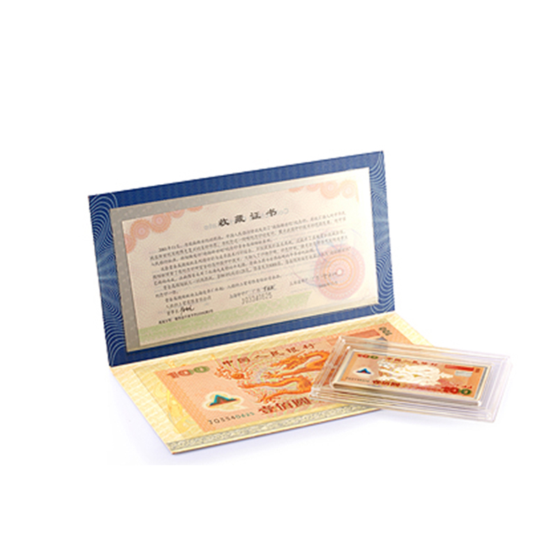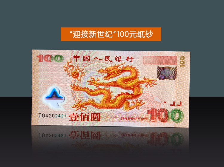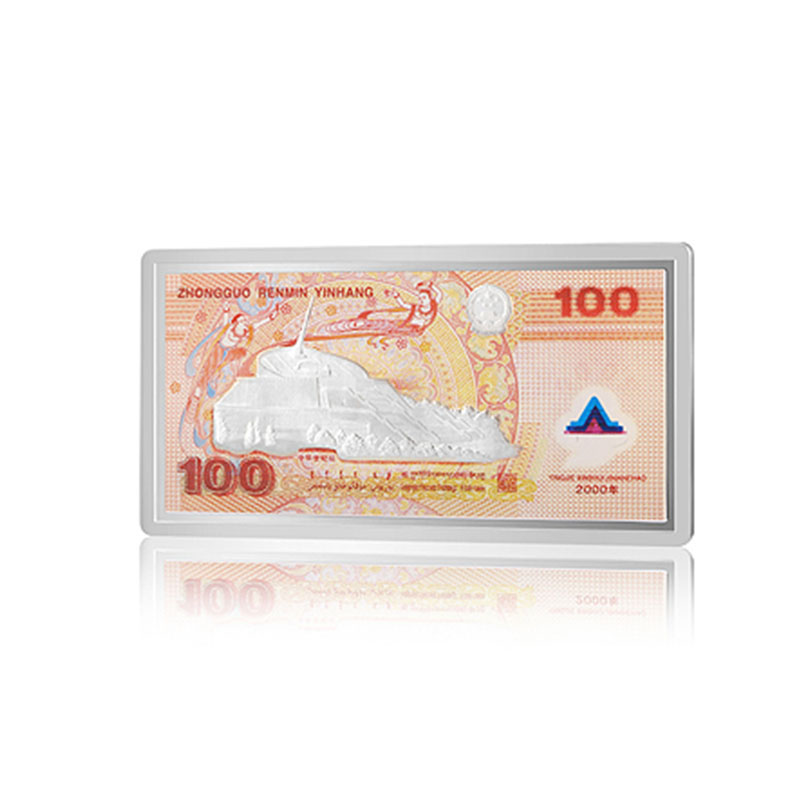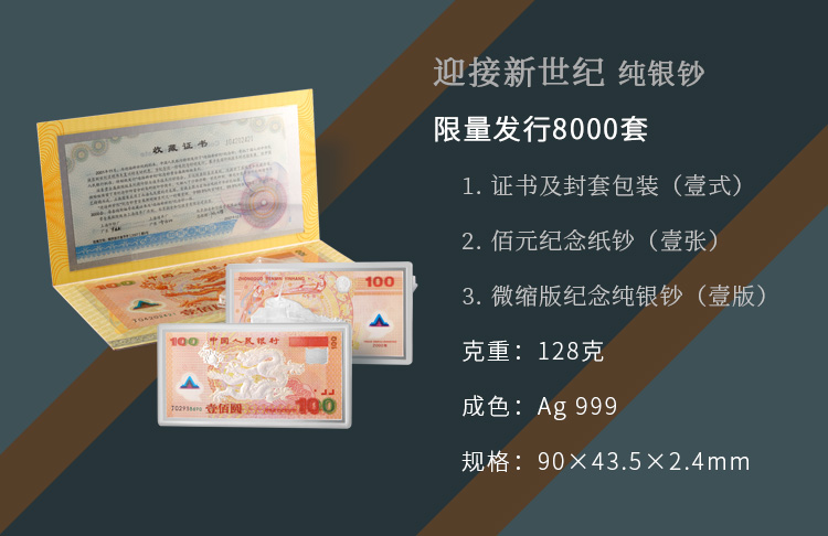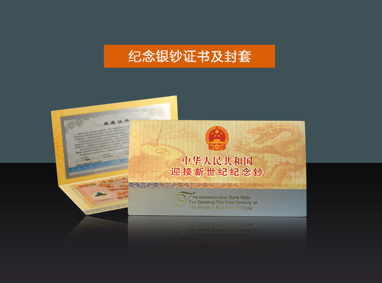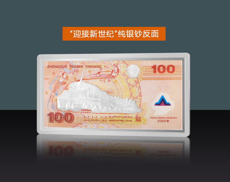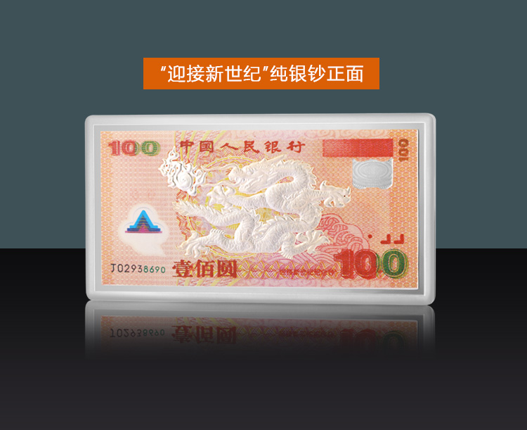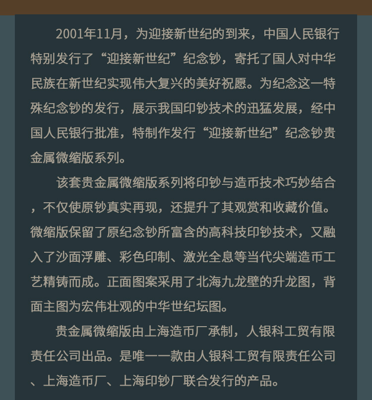 2001年11月,為迎接新世紀的到來,中國人民銀行特別發(fā)行了“迎接新世紀”紀念鈔,寄托了國人對中華民族在新世紀實現偉大復興的美好祝愿。為紀念這一特殊紀念鈔的發(fā)行,展示我國印鈔技術的迅猛發(fā)展,經中國人民銀行批準,特制作發(fā)行“迎接新世紀”紀念鈔貴金屬微縮版系列。該套貴金屬微縮版系列將印鈔與造幣技術巧妙結合,不僅使原鈔真實再現,還提升了其觀賞和收藏價值。微縮版保留了原紀念鈔所富含的高科技印鈔技術,又融入了沙面浮雕、彩色印制、激光全息等當代尖端造幣工藝精鑄而成。正面圖案采用了北海九龍壁的升龍圖,背面主圖為宏偉壯觀的中華世紀壇圖。貴金屬微縮版由上海造幣廠承制,人銀科工貿有限責任公司出品。是唯一一款由人銀科工貿有限責任公司、上海造幣廠、上海印鈔廠聯合發(fā)行的產品。貴金屬微縮版之一的純金版,含99.9%純金198克,限量發(fā)行1000套;銀鑲金版,含99.9%純金18克,含99.9%純銀128克,限量發(fā)行3000套;純銀版含99.9%純銀128克,限量發(fā)行8000套。每套隨附編號收藏證書及“迎接新世紀”紀念鈔一張。